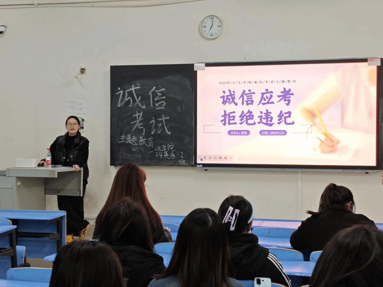 江中新闻网讯(通讯员 陈银)11月23日,人文学院全体辅导员面向所带班级开展了以“诚信应考,拒绝违纪”为主题的诚信考试教育大会。本次主题教育旨在引导学生树立正确的考试观念,将诚信意识内化于心、外化于行。