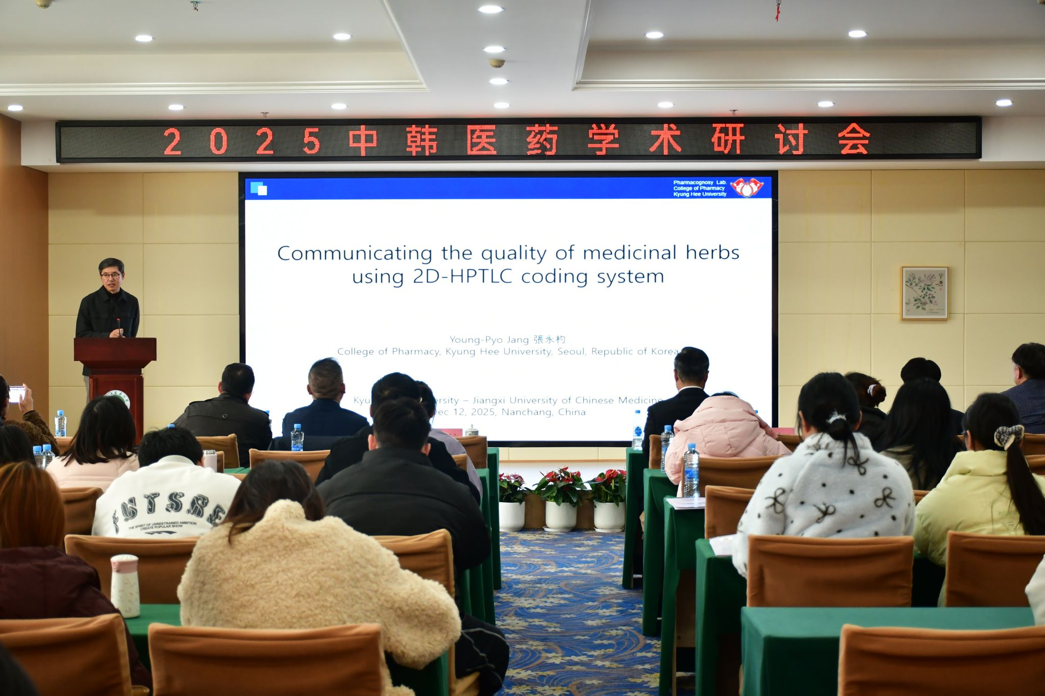 在报告环节中,学校首席教授陈日新系统介绍了“热敏灸”技术的创新机制与机器人辅助系统的临床应用,展现了灸法现代化与智能化的发展前景。韩国庆熙大学药学院院长张永杓教授分享了基于二维高效薄层色谱(2D-HPTLC)的草药质量编码系统,为植物代谢物分类与质量控制提供了新技术路径。