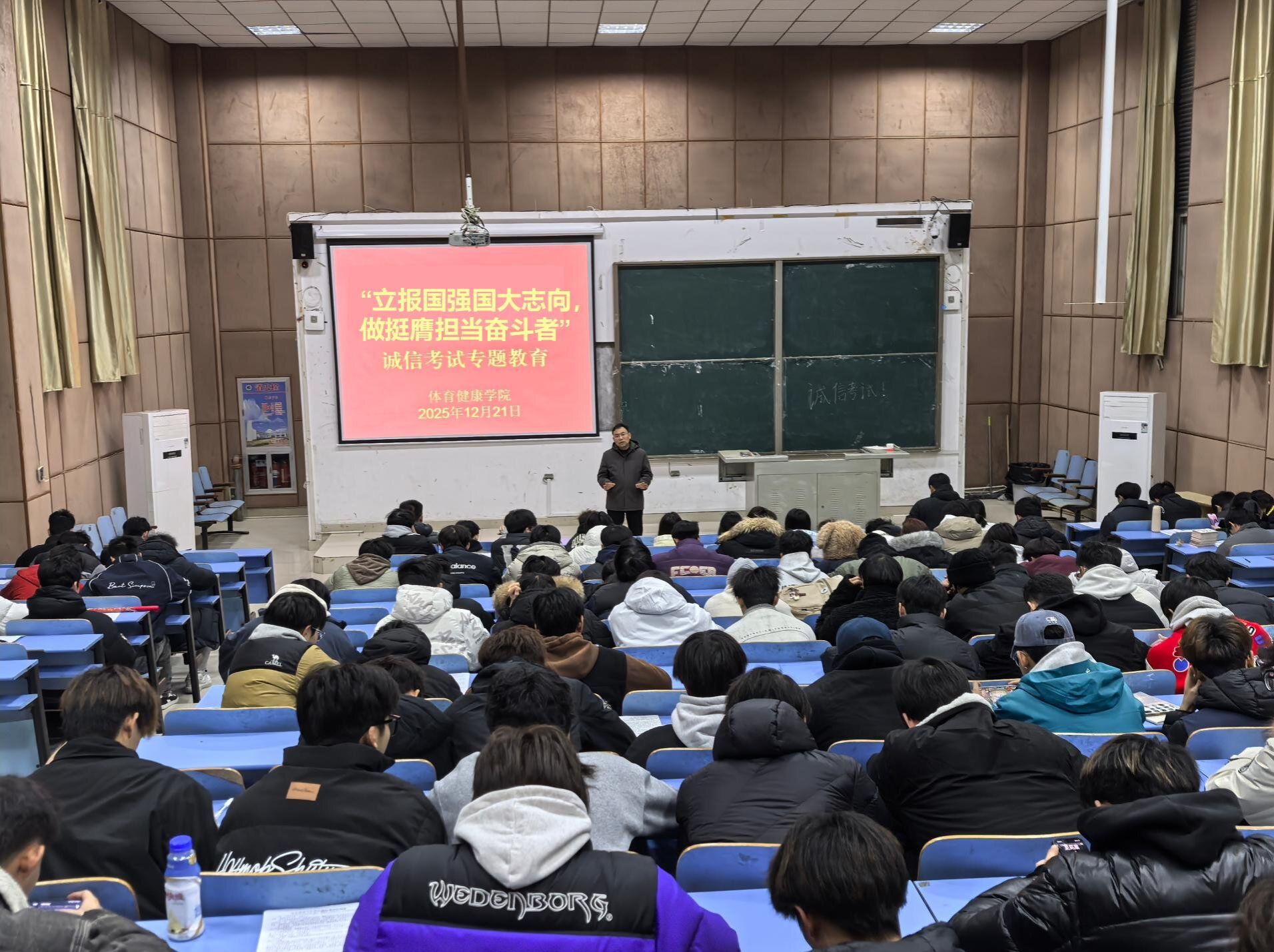 江中新闻网讯(通讯员 吴盛祥) 为进一步加强学院学风建设,培养学生诚信考试观念,营造良好考试风气,同时做好学生期末安全教育,提升学生安全防范意识,12月21日晚,体育健康学院开展“立报国强国大志向,做挺膺担当奋斗者”暨诚信考试专题教育班会。学院党总支书记、党总支副书记兼副院长、辅导员、全体在校生参会。