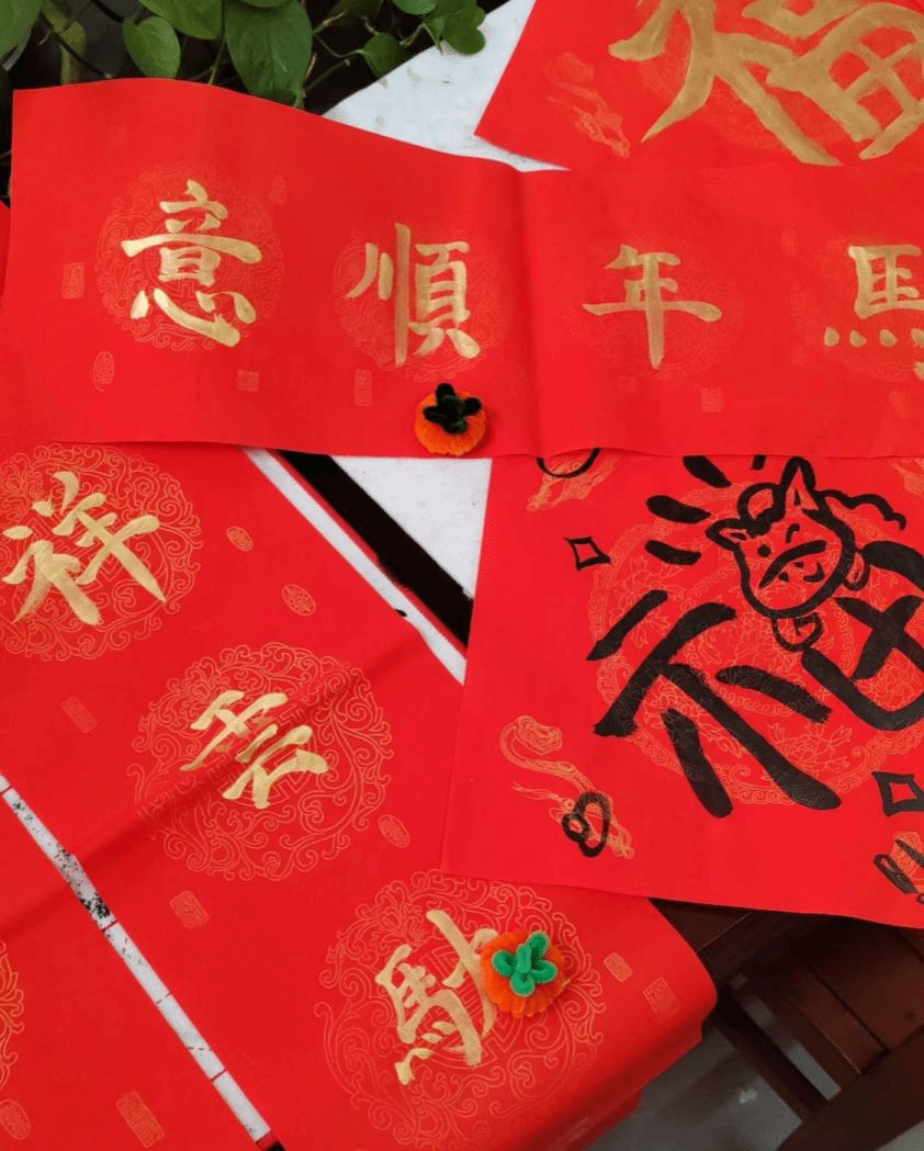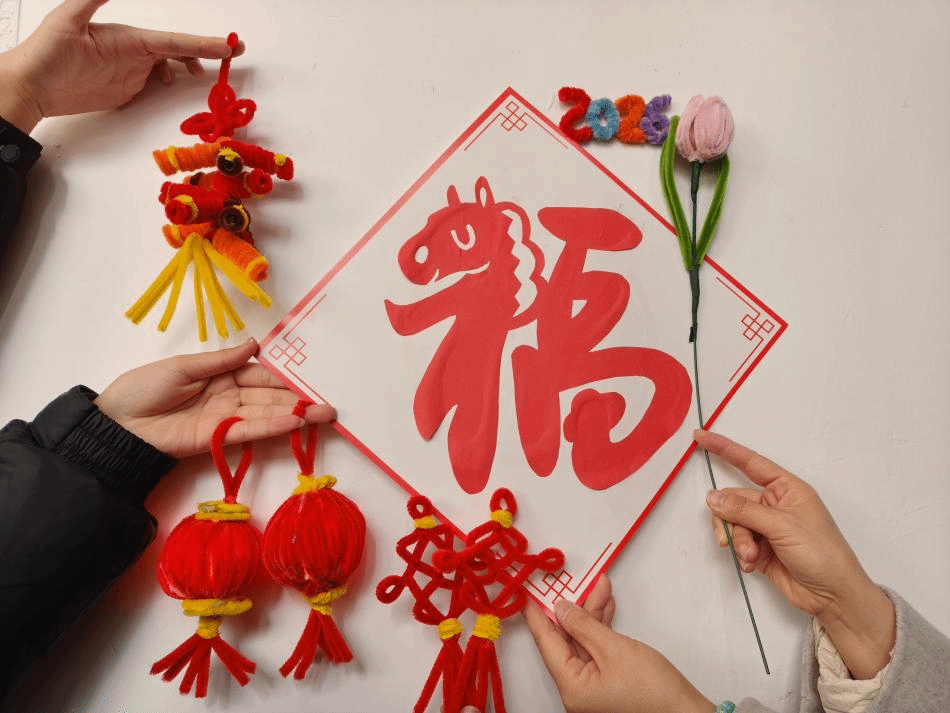 各体验区域分工明确、热闹有序。写春联区域,书法爱好者凝神挥毫,笔墨流转间,一幅幅字迹工整、寓意吉祥的春联渐次成型;剪窗花区域,同学们手持剪刀,红纸在指尖翻转跳跃,精致的福字、灵动的小马等图案跃然纸上;扭扭棒制作区则创意十足,色彩鲜艳的扭扭棒被同学们巧妙打造成绽放的烟花、精致的灯笼等挂件。大家不时相互交流技巧、分享创作心得,现场满是欢声笑语,洋溢着轻松愉悦的节日氛围。