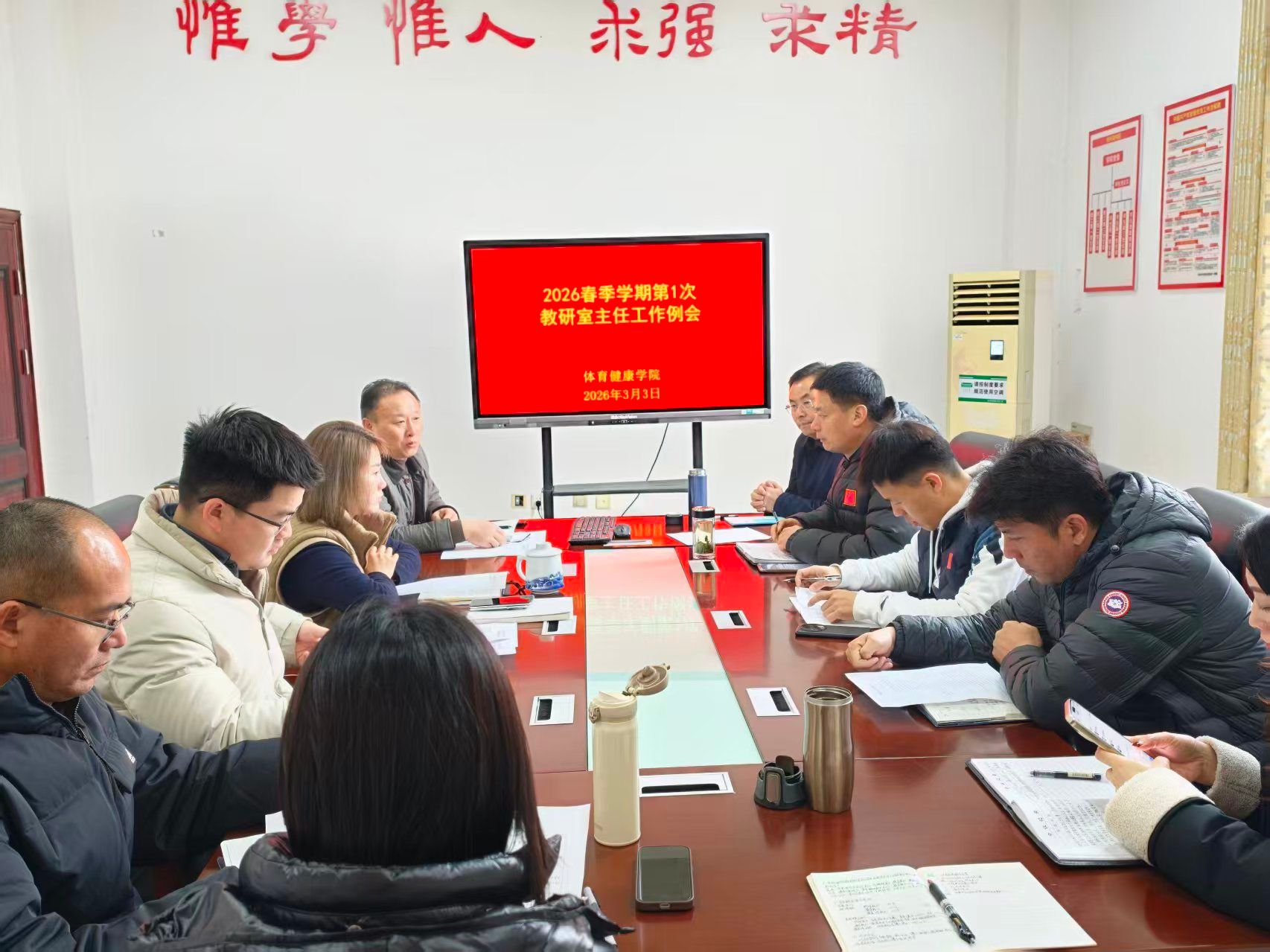 江中新闻网讯 为系统规划新学期工作,确保教学科研任务稳步推进,3月3日上午,体育健康学院在学院一楼会议室召开了2026年春季学期第一次教研室主任工作例会。会议由学院行政主要负责人主持,学院党政领导班子成员、各教研室主任及教学科研办公室相关人员参加了本次会议。