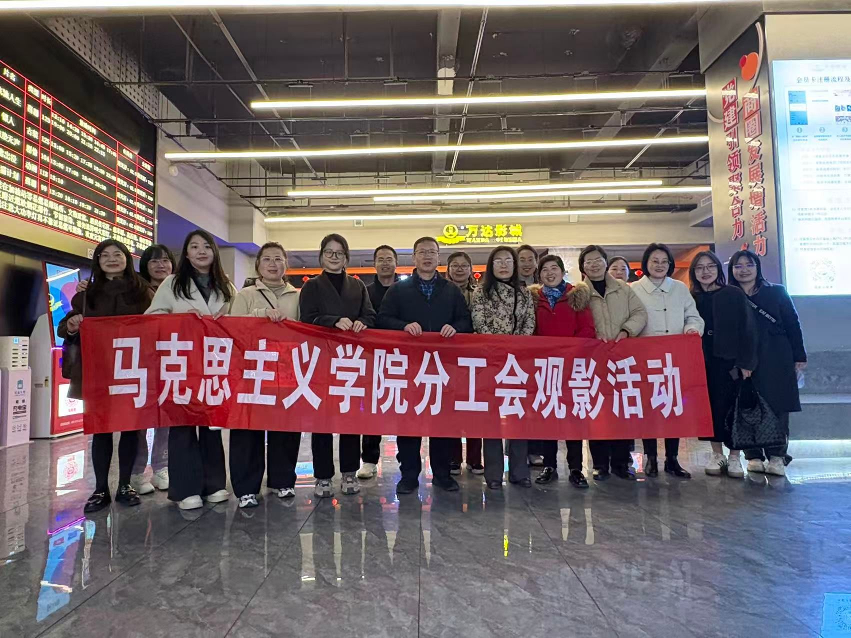 江中新闻网讯(通讯员 陈华)在第116个“三八”国际妇女节来临之际,为丰富女教职工的精神文化生活,缓解工作压力,马克思主义学院分工会于3月6日下午组织学院女教职工走进湾里爱琴海万达电影院,集体观看励志影片《飞驰人生3》。学院党总支书记在观影前与大家一起合影留念。