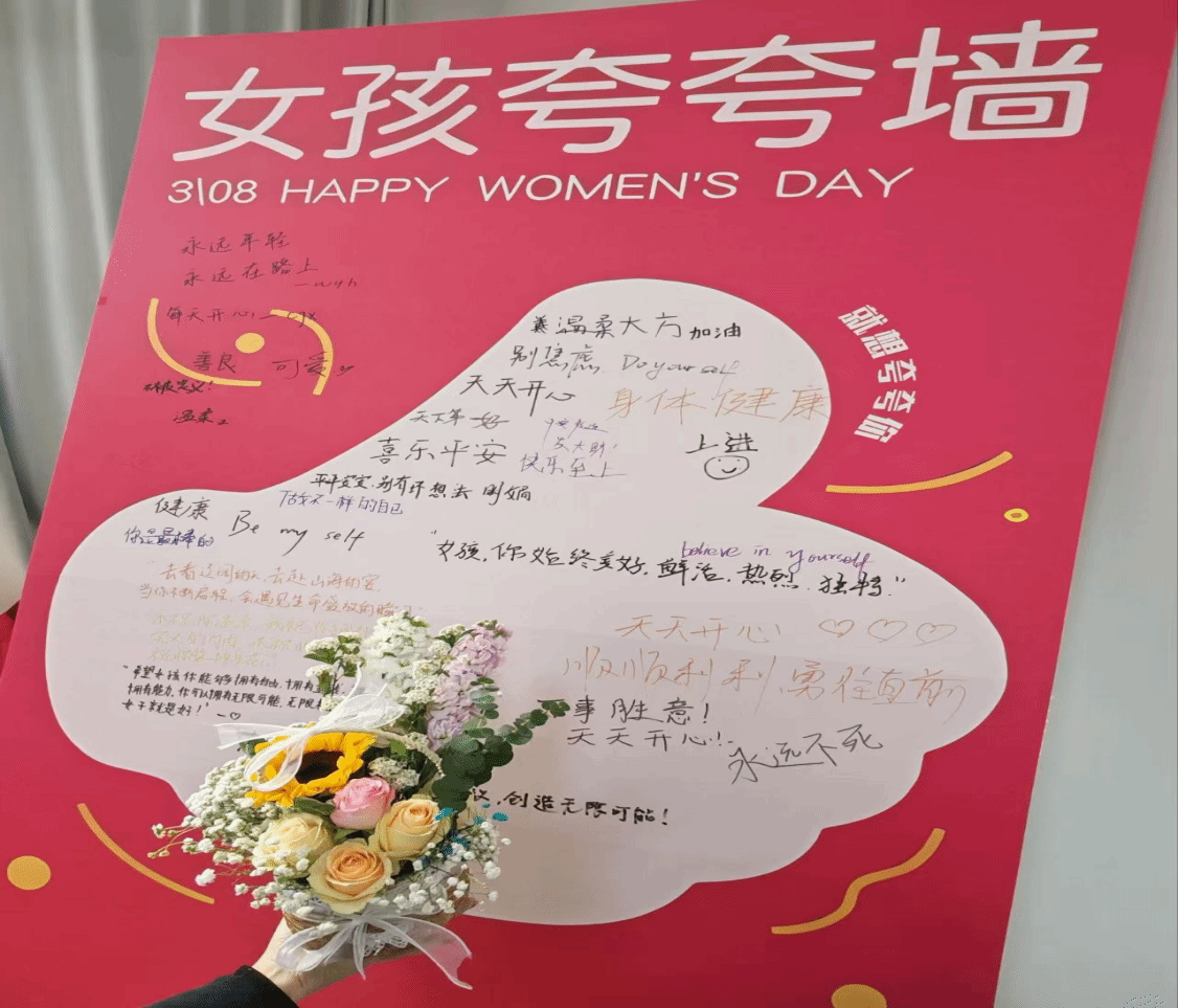 活动现场花香萦绕,暖意融融。在专业花艺师与学院志愿者的指导下,参与者们从花材识别、枝叶修剪到色彩搭配、造型构思,一步步完成专属花艺作品。大家以向日葵、康乃馨、洋桔梗等为媒,将春日生机与对女性力量的赞颂融入指尖,在摆弄花叶的过程中感受草木疗愈之力,舒缓日常学习与工作的疲惫。现场还设置了“女孩夸夸墙”,师生们纷纷写下“天天开心”“喜乐平安”等暖心祝福,在互赠花艺、分享寄语的过程中拉近了彼此距离。
