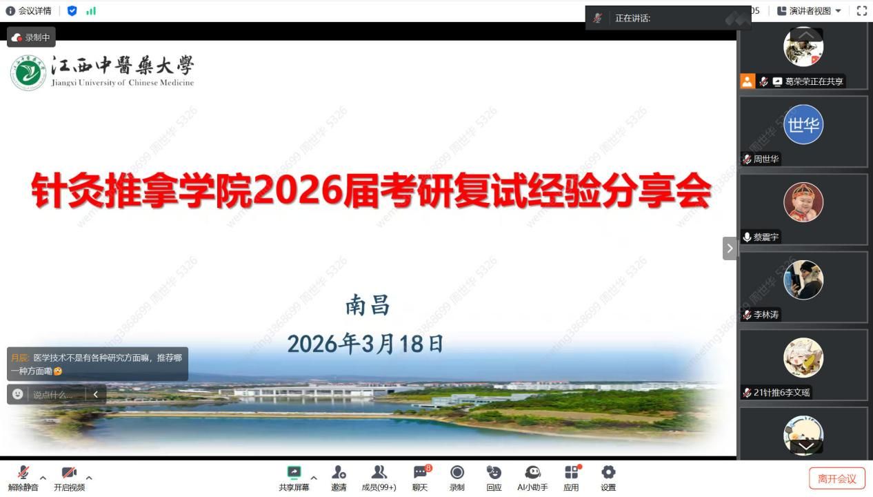 江中新闻网讯(通讯员 葛荣荣 周世华)为助力2026届考研学子在复试阶段取得优异成绩、增强备考信心,3月18日,针灸推拿学院通过线上平台举办考研复试经验分享会。本次分享会特邀7位2025届优秀毕业生分享复试心得,吸引一百多位即将参加复试的同学在线聆听并积极互动。