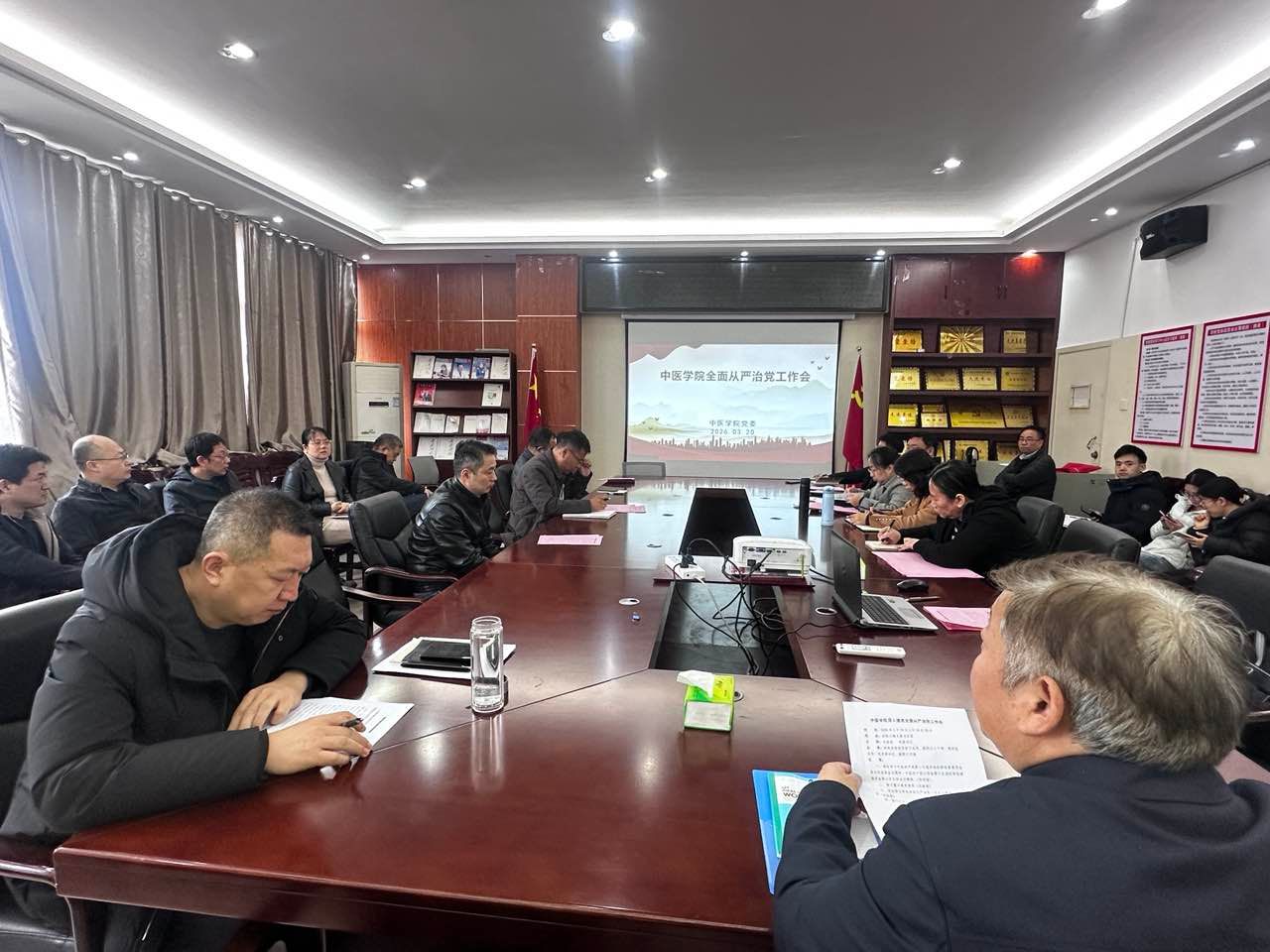 江中新闻网讯(通讯员 张永云)3月20日,中医学院召开深入推进全面从严治党工作会议。学院党委书记主持会议,学院党委领导班子成员、副科以上干部、各教研室主任、各党支部书记及教职工代表参加会议。
