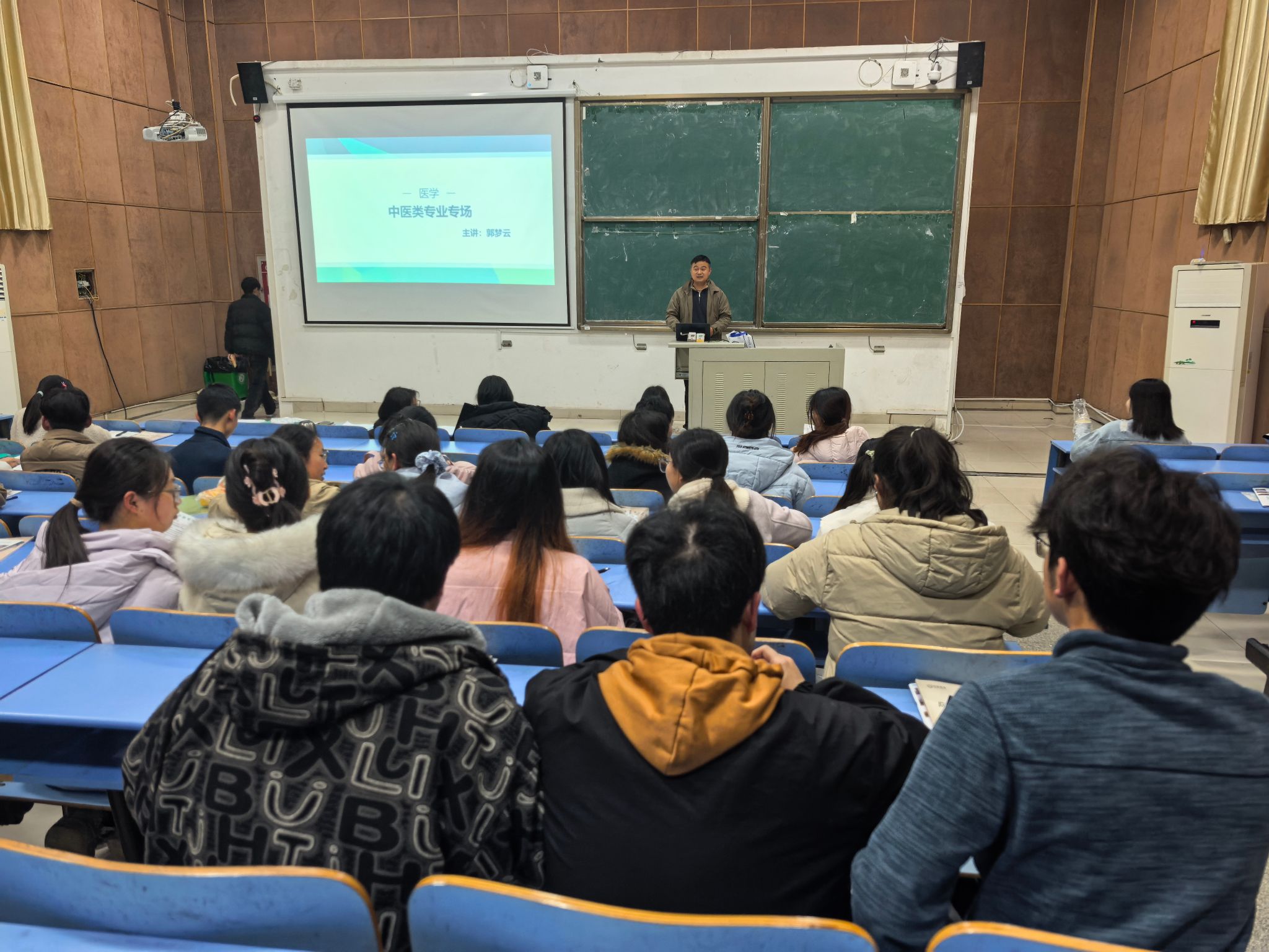 江中新闻网讯(通讯员 熊水明)为帮助学院学生更好地规划考研路径,提升备考效率,针灸推拿学院于3月19日在教学楼T2教室举办2026年考研规划指导专题讲座。本次讲座邀请了宏医教育中医综合首席主讲郭梦云老师作为主讲嘉宾,吸引了百余名有志于考研的学生参加。