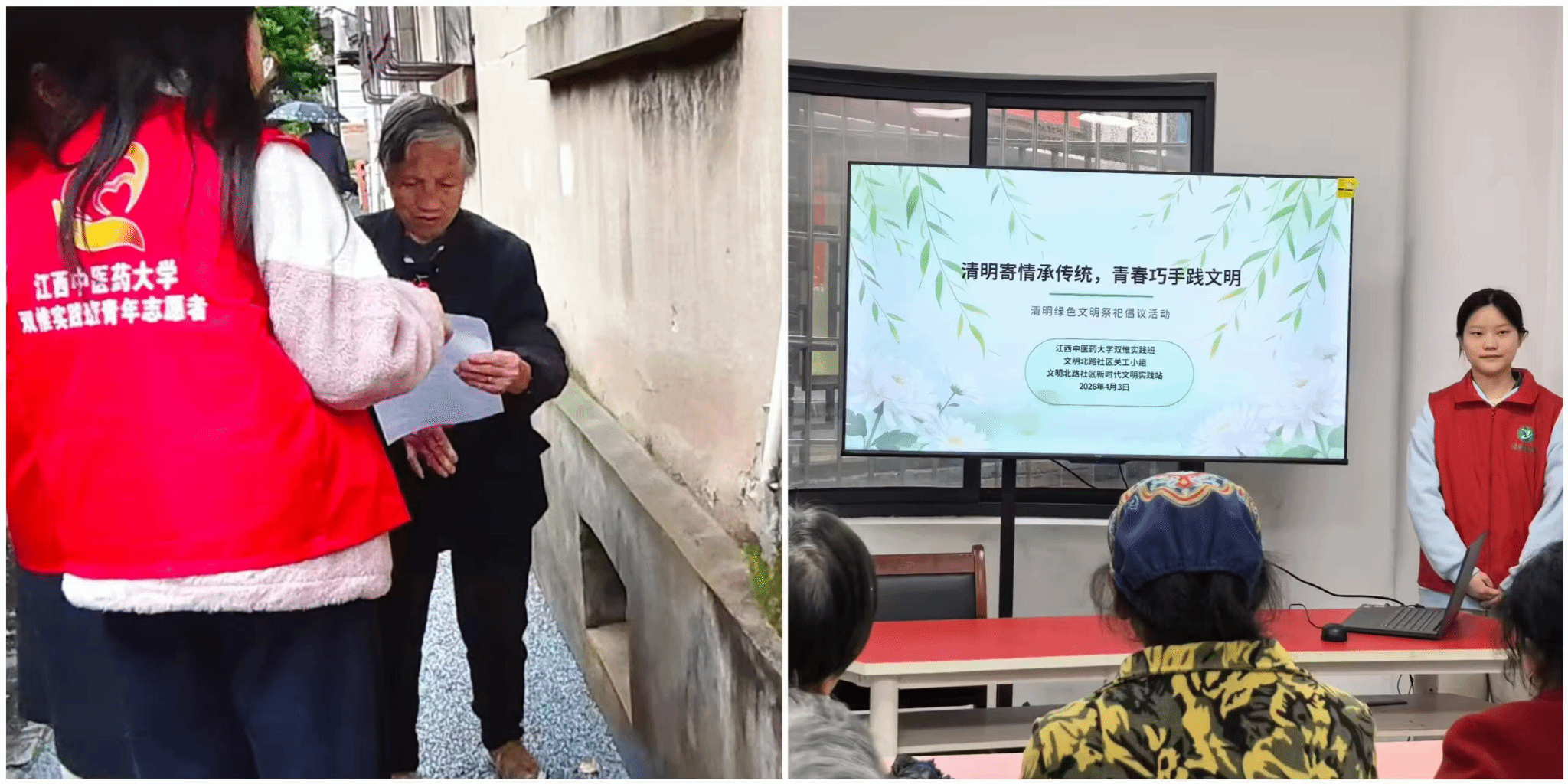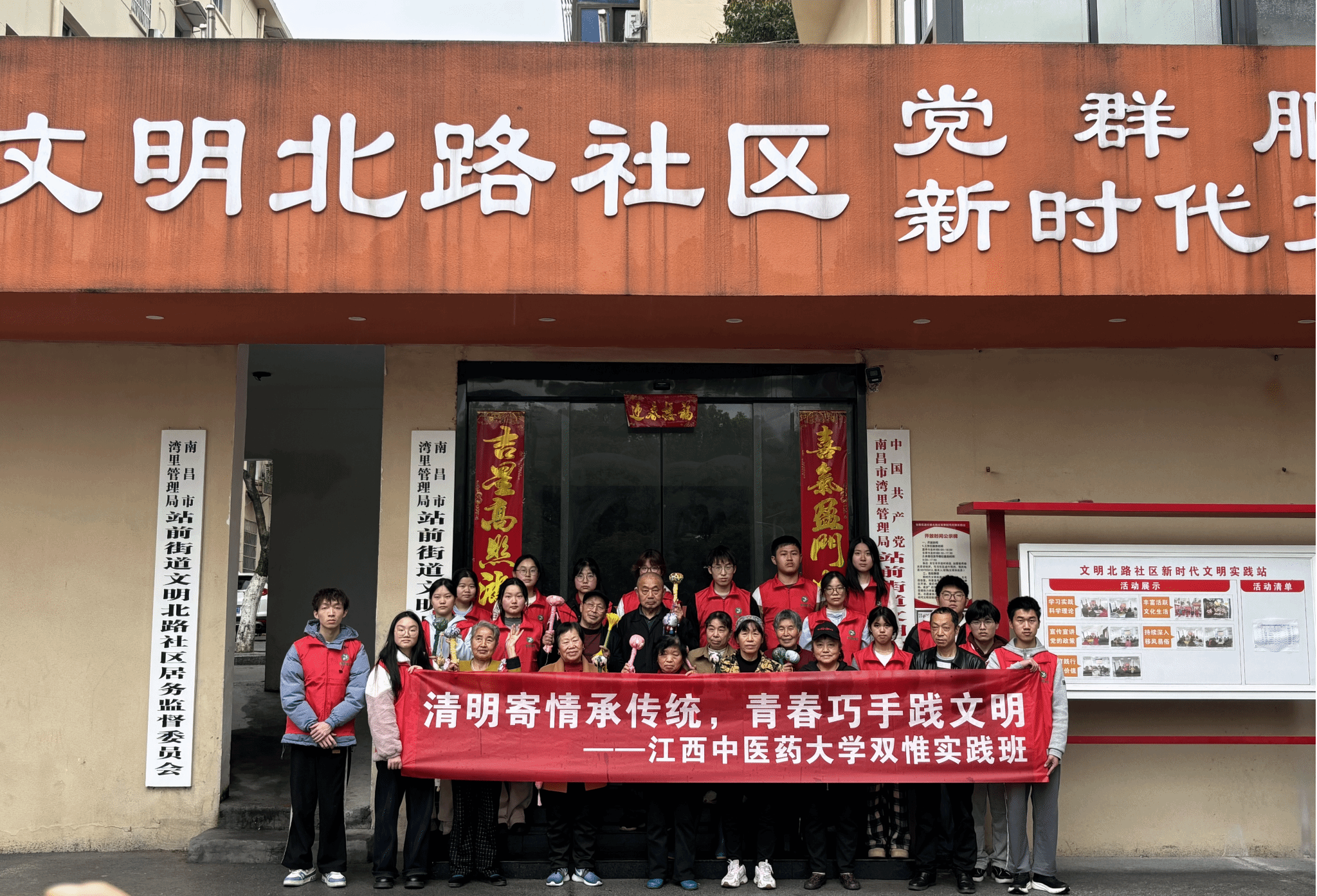 江中新闻网讯(通讯员 吴梅红)清明寄哀思,文明树新风。为深入培育和践行社会主义核心价值观,弘扬文明祭扫新风尚,同时发扬双惟班志愿服务精神,深化双惟学子社会责任感与实践能力培养,引导青年学子立报国强国大志向、做挺膺担当奋斗者,4月3日下午,江西中医药大学双惟实践班前往文明北路社区开展“清明寄情承传统,青春巧手践文明”主题志愿服务活动,以实际行动传递青春正能量,助力社区文明建设。