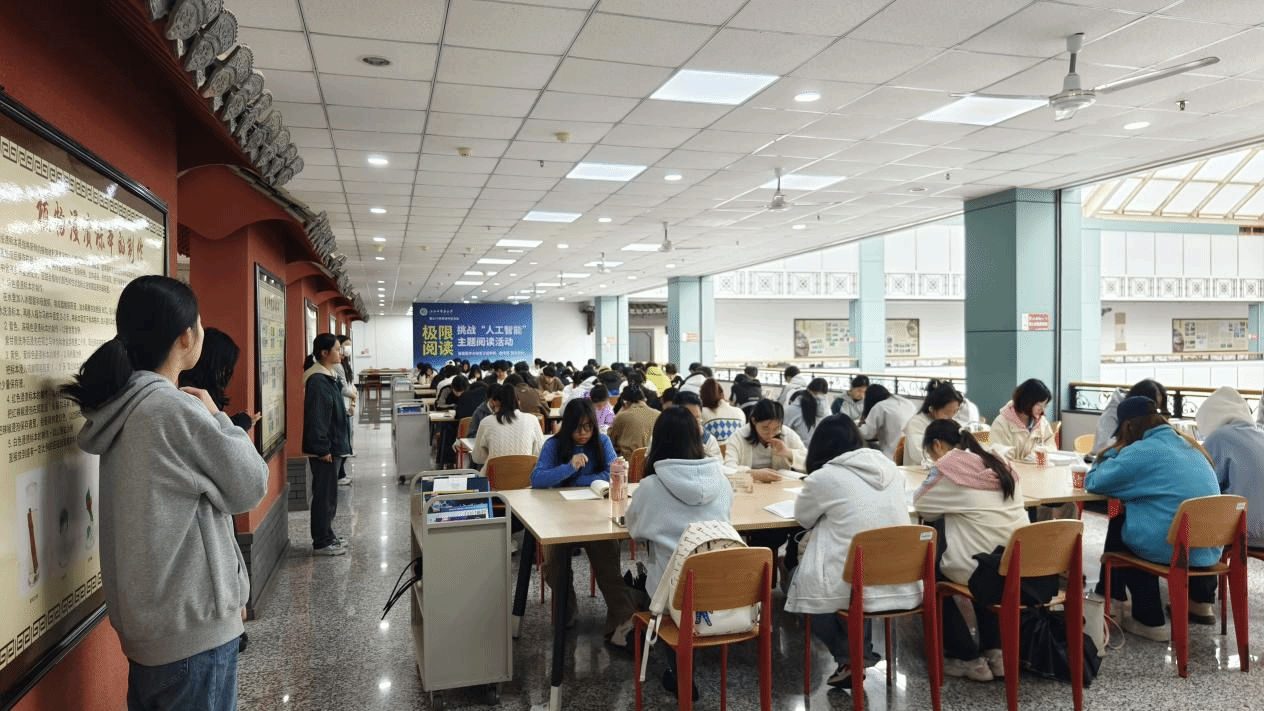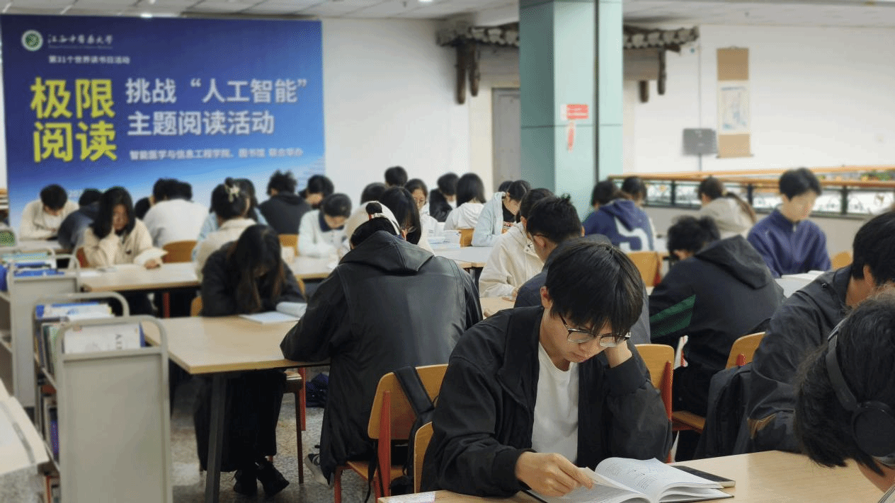 江中新闻网讯(通讯员 封勇)为助力全校师生系统了解人工智能相关知识、更好适应时代发展需求,图书馆联合智能医学与信息工程学院,于4月23日世界读书日当天,在图书馆4楼大厅举办极限阅读·挑战“人工智能”主题阅读活动,全校百余名师生报名参与本次沉浸式阅读挑战。
