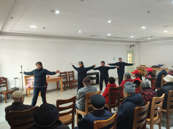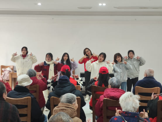 学院功法队队员为老人们表演华佗五禽戏,博得了阵阵掌声。志愿者们表演的手势舞《开心往前飞》逗得老人们开怀大笑。