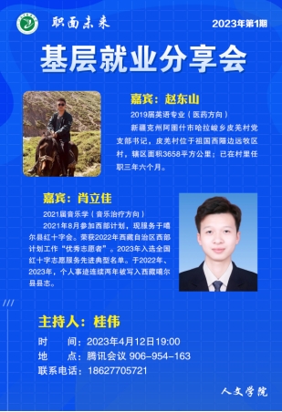 江中新闻网讯(通讯员叶欣宇高贵森)为拓宽学生就业知识面,全面提升学生综合就业能力,促进学生实现高质量就业,4月12日,人文学院通过线上方式组织开展2023年基层就业线上分享会。本次分享会诚邀2019届英语专业赵东山与2021届音乐治疗专业肖立佳等两位优秀基层就业毕业生进行分享交流,我院辅导员以及40余位2023届学生参加。