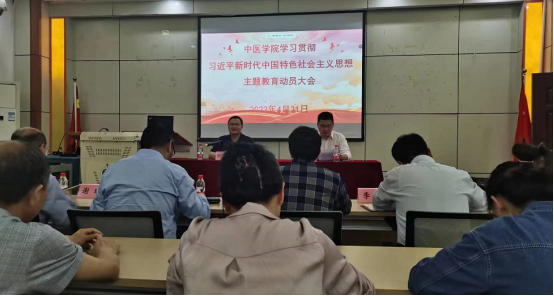 中医学院党委负责同志结合主题教育的总要求和目标任务,从三个方面进行动员部署,一是压实领导责任。各级党组织要切实担负起主体责任,认真履职,靠前指挥,特别是各支部书记要履行第一责任人职责,以高度的政治自觉从我做起,带头转变作风,强化担当意识,高标准落实各项任务。二是强化统筹兼顾。各级党组织和广大党员干部要坚持围绕中心、服务大局,防止“两张皮”,切实把开展主题教育同落实党中央、省委和学校党委部署要求结合起来,同推动学校高质量发展结合起来。三是营造浓厚氛围。要充分发挥好校园网、微信公众号的宣传辐射作用,及时宣传刊发学院主题教育的工作进展、实际成效和好经验、好做法,在全院范围内掀起开展主题教育的热潮。