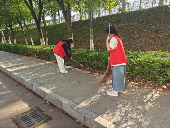 活动中,志愿者们身着红马甲,带上扫把、撮箕等工具,根据活动方案划分的卫生整治区域,与后勤保障服务中心环境卫生管理人员一起对校园路面、人行道中的杂草、草坪上的落叶、张贴的垃圾广告进行了彻底清理、对乱停乱放的电动自行车进行摆放。通过大家的辛勤劳动,校园中积存的杂物、废弃物得到了彻底的清除,被清扫后的草坪瞬间变得干净整洁。此外,后勤保障服务中心在校园显著位置悬挂了“积极参与垃圾分类、共同呵护绿色校园;绿色低碳你我他,垃圾分类靠大家”的宣传横幅,旨在提高广大师生员工垃圾分类意识,加强垃圾分类知识宣传。