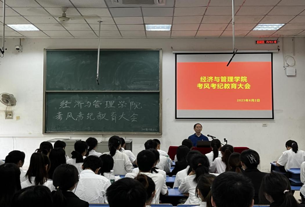 江中新闻网讯(通讯员 王冉)为切实加强考风考纪教育,增强学生诚信意识,端正学习态度,树立良好学风,6月2日,经济与管理学院在5102召开考风考纪教育大会,学院党委负责人、全体辅导员、学生党员共100余人参加。
