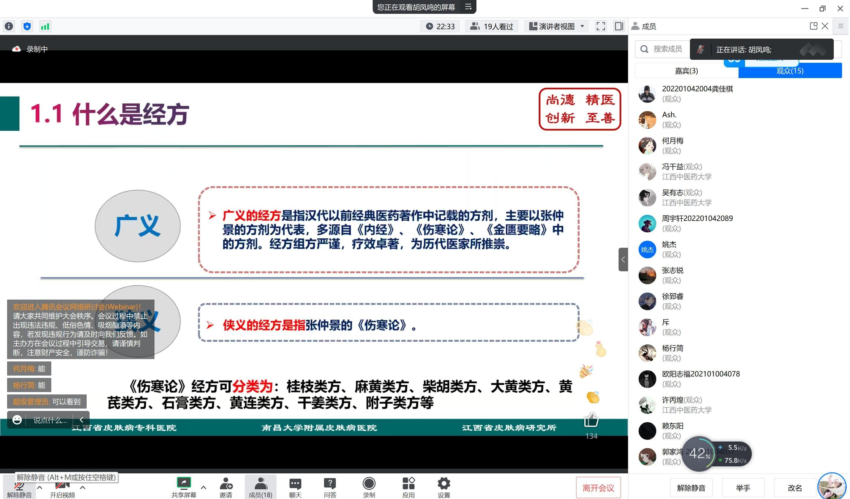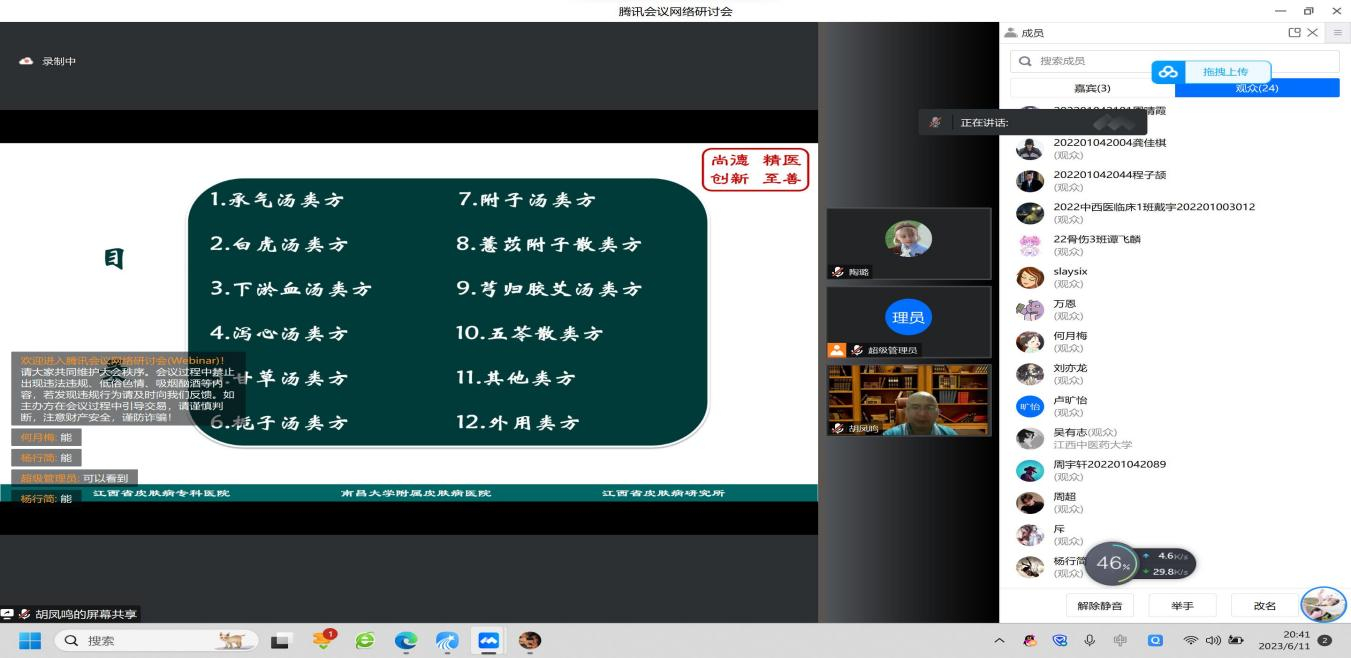 江中新闻网讯(通讯员 陶璐 刘泓岐)6月11日晚,由教务处主办,临床医学院承办的第七十三期云端中医大讲堂在腾讯会议平台进行线上直播。江西省皮肤病专科医院中西医结合科主任医师胡凤鸣做客本期讲堂。临床医学院、中医学院、针灸推拿学院、药学院等学院300余名师生在线参与了本次讲座。