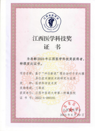 江中新闻网讯(通讯员 彭志鹏)6月29日,第二届江西医学科技奖颁奖大会在南昌召开,大会颁发了第二届江西医学科技奖、青年科技创新奖和科普奖。二附医院梁瑞宁教授团队的“基于’冲任新说’理论治疗子宫内膜异位症关键技术的研究与应用”(项目编号2022—A—080181)喜获第二届江西医学科技奖三等奖!