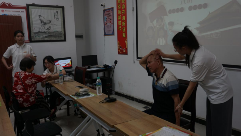 活动第二天,实践小分队前往景德镇珠山区太白园街道曙光村社区开展志愿服务活动。队员们发挥专业特长向小区居民宣讲了习近平新时代中国特色社会主义思想及中医药文化相关知识,介绍了夏季养身保健小常识,向居民发放了足浴中药包,为他们测量血压、推拿、按摩等。志愿服务活动得到了社区居民的一致好评。