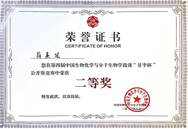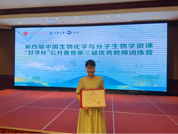 江西省生物化学与分子生物学会根据2022年度江西省生物化学与分子生物学微课竞赛的结果,推选我校翁美芝老师参赛,翁老师参赛的题目是“氧化磷酸化”,为了使氧化磷酸抽象的知识和原理形象化、生动化和通俗化,翁老师采用比喻、类比和动画等方式进行授课,取得了良好的教学效果,并荣获比赛“二等奖”。