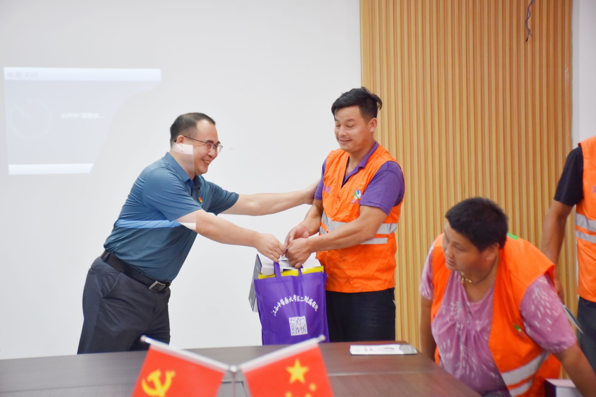 医院党委书记向坚守岗位、奋战在高温酷暑中的环卫工人表达深深的敬意和诚挚的问候,并叮嘱大家在坚守工作岗位时,要增强自我防护意识和防范能力,做好防暑降温措施。随后将清甜解暑的生活物资和防暑降温药品等物资一一送到环卫工人手中。