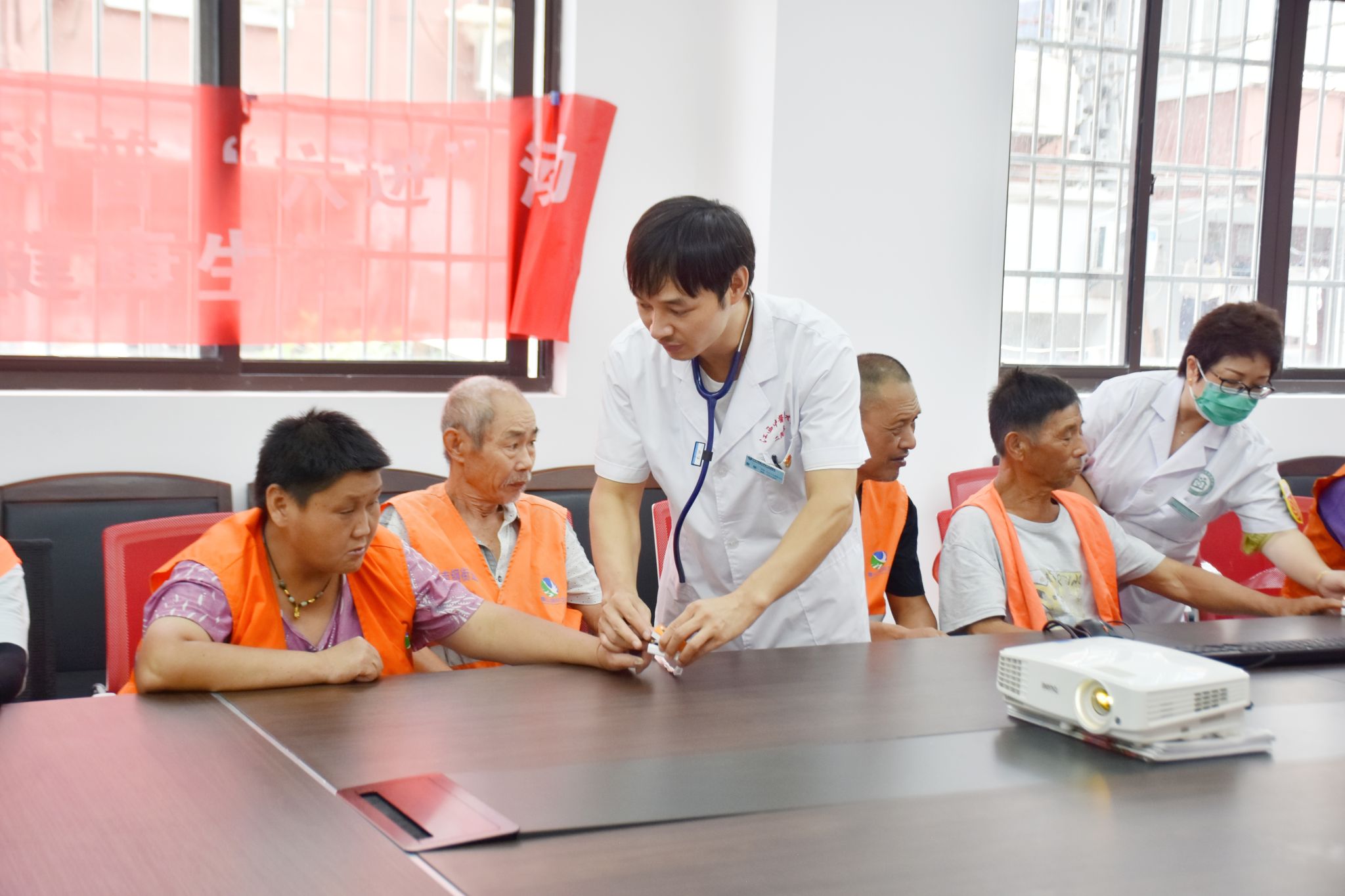 活动中,党员志愿者为为现场环卫工人开展了题为“预防中暑小诀窍”的健康科普宣教,并提供了健康义诊服务,为他们测血压、测血氧饱和度、发放免费体检卡,并再三叮嘱他们在做好工作的同时要注意防暑降温、劳逸结合。
