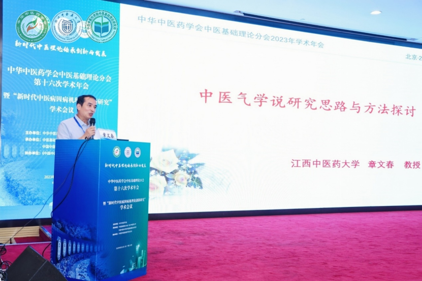 我校章文春教授作为中医基础理论分会副主任委员之一,带领江西中医药大学中医基础理论师生代表团队参加了本次会议,并在大会上作题为“中医气学说研究思路与方法探析”的专题报告。介绍了中医“气”的理论内涵和实质,提出采用内证体察和外求实证两种方法,运用现代科学技术手段对“气”进行实证研究,分享了内证体察的实践研究成果。