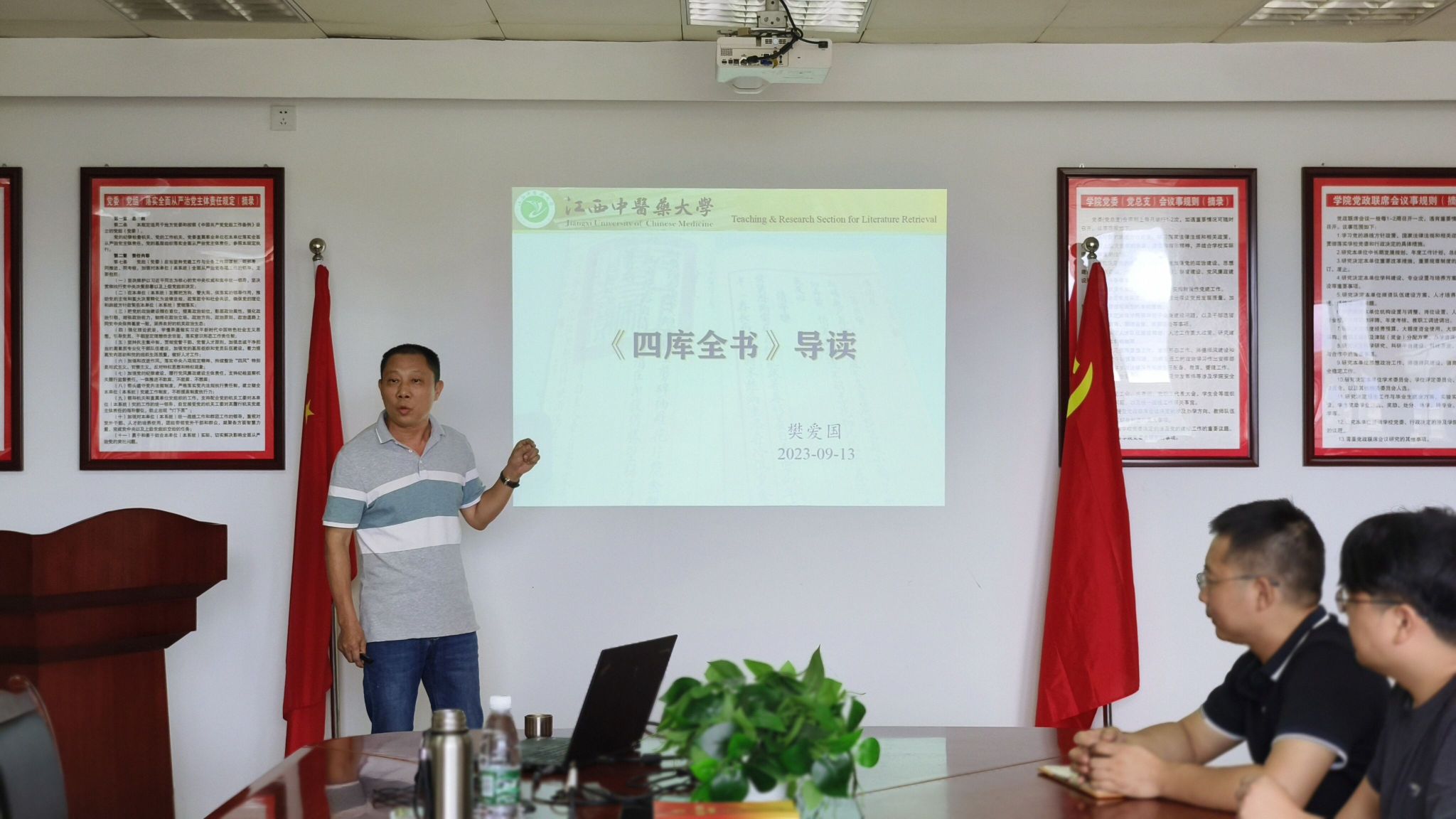 江中新闻网讯(通讯员 黎莉)为引导广大职工在读书中传承中华文明,坚定文化自信精神力量,9月13日上午,图书馆在三楼会议室开展了以“坚定文化自信 谱写使命华章”为主题的读书分享会。本次分享会由文献检索教研室主任樊爱国围绕主题进行“《四库全书》导读”分享。