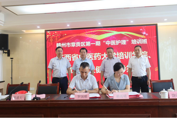 培训学院培训部负责人与章贡区卫健委二级主任科员赖雨晴进行签约仪式,并向章贡区第一期“中医护理”培训班负责人授予班旗。