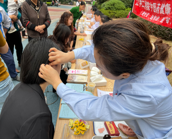 义诊现场,医务人员免费为居民测血糖、血压,同时引导他们体验耳穴压豆、艾灸、中医推拿和中药茶饮等中医特色服务项目,并向社区居民普及颈椎操、八段锦等中医保健运动,让中医药健康服务走进更多百姓日常生活;医疗专家耐心细致地解答居民常见病、多发病的预防诊治及愈后疑难问题,给予科学的治疗建议。