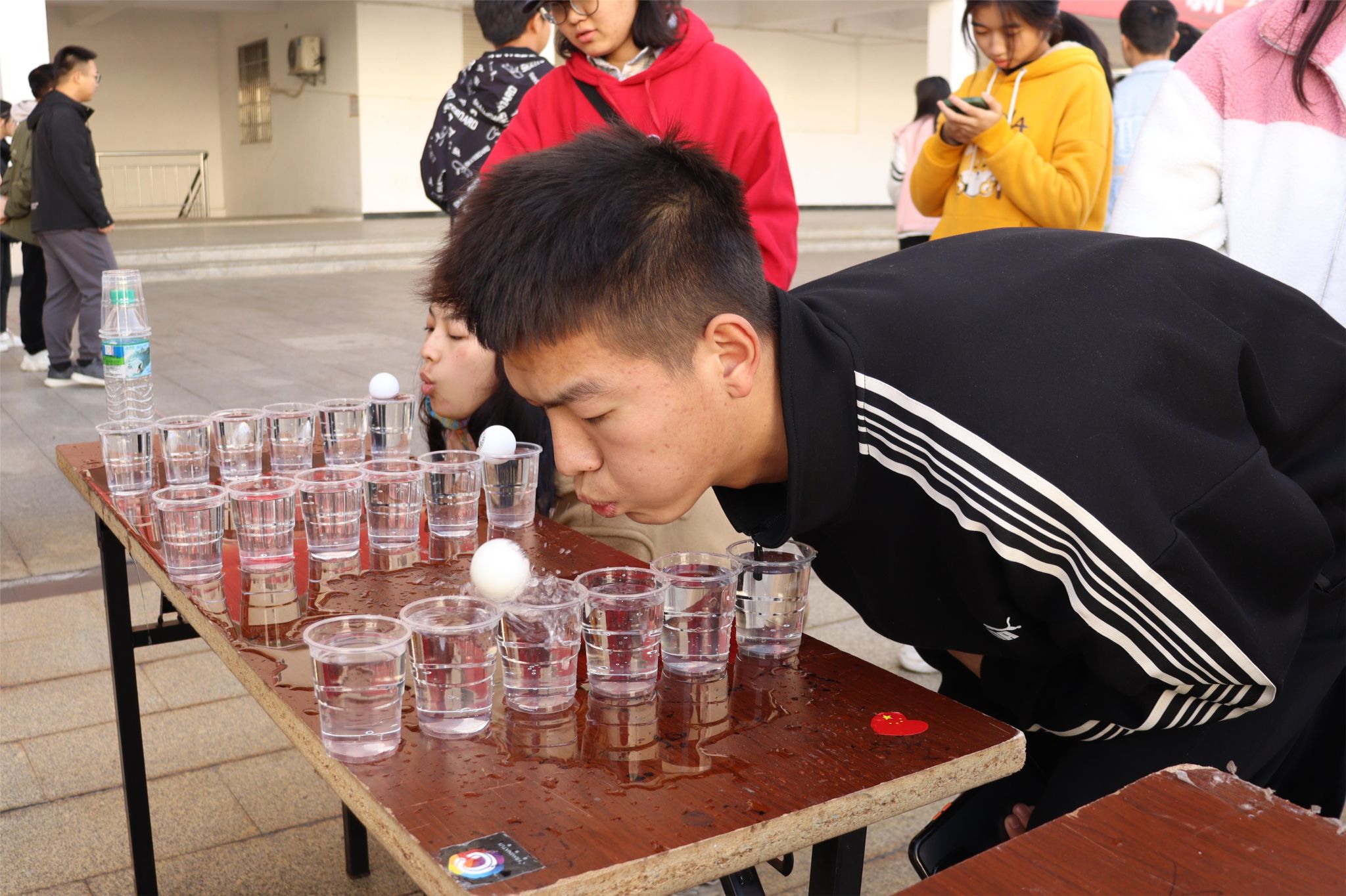 趣味运动会中,首先开展的活动是“两人三足”跑,参与人员两两一组,跌跌撞撞地在起点和终点之间折返跑。随后,开始“一二三木头人”小游戏,五名参与人员分别扮演木头人和移动者,在工作人员的口令下开展游戏。紧接着进行吹乒乓球和背夹球游戏,两人一组,背对而站,中间夹一个气球,从起点运至终点,中途双手不能触碰气球,按完成时间长短进行排名。各小组配合默契、失误遗憾等不同表现为现场带来无限欢乐。最后在“挤眉弄眼”游戏中,同学们纷纷调动自己的五官,努力把饼干从额头移到嘴里,现场气氛十分热烈,欢声笑语不断。