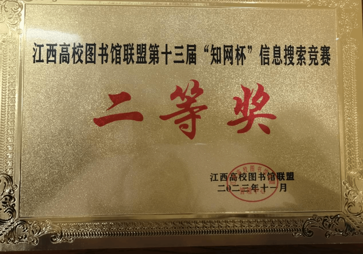 江中新闻网讯(通讯员 余俊英)2023年11月21日,我校代表队在“江西高校图书馆联盟第十三届‘知网杯’信息搜索竞赛”中荣获二等奖,樊爱国、陆有美两位老师获得“优秀指导老师”称号。