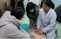 培训分为理论讲解和实践操作两部分,讲解员从“认识心脏骤停”“急救流程”和“AED的使用”三个方面进行详细讲解,并现场进行实操训练,特别强调现场急救“黄金4分钟”对抢救成功的重要性,并着重演示了心肺复苏术和AED使用方法。现场互动气氛积极活跃,参与培训的教职工们纷纷自告奋勇上台参与实操,在授课人员的指导下反复进行心肺复苏术和AED操作练习,快速、准确、熟练地掌握心肺复苏术和AED操作等急救基本技能。