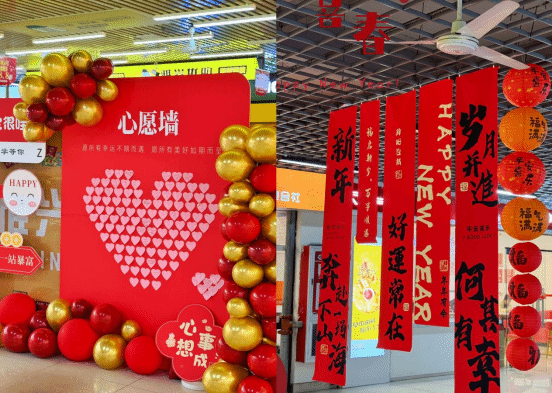 本次活动让师生在年末紧张的工作学习之余放松身心,营造喜庆、祥和的节日氛围。商城布置了丰富的新年主题元素,设置了心愿打卡墙,组织商家开展让利促销活动,吸引了大批师生驻足,纷纷在心愿墙留下自己的新年心愿。