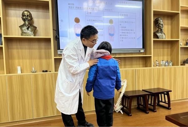 活动伊始,柴非老师给同学们详细讲解了关于脊柱侧弯的知识,用骨骼模型演示了脊柱侧弯的危害以及如何保护和预防脊柱侧弯等方面的知识。课后,柴非老师在现场给同学们检查了脊柱健康状况,并殷切地叮咛孩子们预防脊柱侧弯的关键是身体姿势得正确。在日常生活中,要选择软硬适中的床,保持正确的坐姿,不要单肩背书包和长时间趴在课桌上睡觉等。他强调,如果出现脖子疼、背痛、腰痛等疑似脊柱侧弯的情况,要及时到医院检查,做到早发现、早诊断、早治疗。