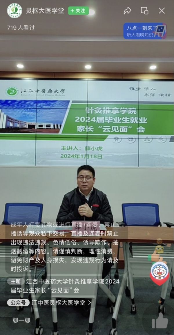 本次以直播的形式,召开线上家长会是针灸推拿学院“家校协同”育人工作的重要环节,也是在新形势下学院为破解就业困境,推动毕业生就业创业工作的创新举措。通过本次家长会,一方面统一了思想,让家长了解学生的就业方向,明确学生面临的就业压力和潜在的机遇,从而在家庭层面帮助学生调整好就业心态,把握良机。另一方面也搭建起了家校就业信息网络互动平台,使就业信息在学院和家长双线推送机制下得到更有效利用。