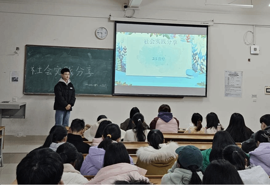 各班级社会实践优秀代表利用视频、演示文稿等形式围绕实践内容、实践成果、心得体会等方面对寒假社会实践开展情况进行了具体介绍。活动现场气氛热烈,一段段真挚的心得体会、趣味横生的实践故事引起了同学们的共鸣。