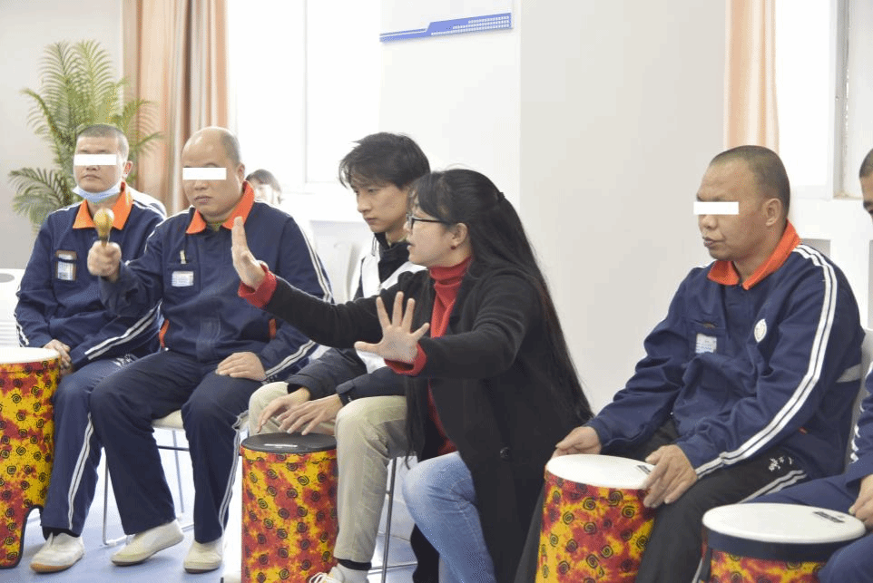 团辅活动分为四个环节:前期预热、鼓圈律动、正念冥想和体验分享。前期预热中,志愿者引导戒毒人员用乐器按节拍练习,以减轻心理防备,熟悉流程。随后,大家投入鼓圈律动,与师生团队合作,呈现一场独特的“音乐会”。在志愿者引导下,戒毒人员练习正念冥想,进入深度放松状态,调节情绪。结束时,戒毒人员分享感受,“快乐”“舒适”“放松”等词汇成为他们内心状态的真实写照,感受到心灵的慰藉与支持。