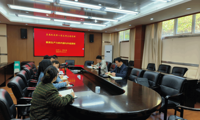 江中新闻网讯(通讯员 朱武 刘路华)3月21日,直属机关第八党支部在行政楼一楼会议室开展专题党课学习,支部书记以《新质生产力的内涵与外延》为题,为支部全体党员讲授了一堂专题党课。
