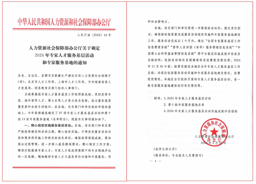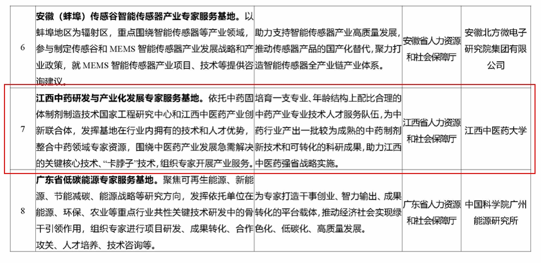 江中新闻网讯(通讯员 王琦)近日,人社部办公厅发布《人力资源和社会保障部办公厅关于确定2024年专家服务基层示范团和专家服务基地的通知》(人社厅函[2024]44号),公布了第十批专家服务基地,由我校中药固体制剂制造技术国家工程研究中心申报的“江西中药研发与产业化发展专家服务基地”成功获批。