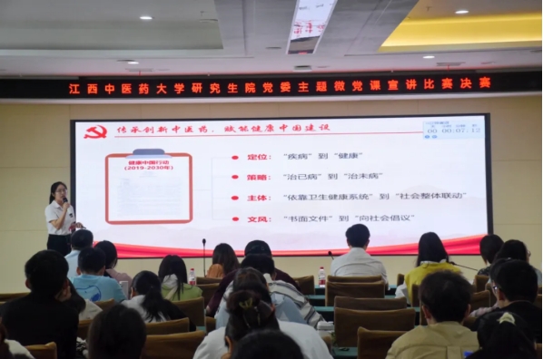 9位党员宣讲人依次登场,围绕“在习近平新时代中国特色社会主义思想指导下,中国共产党团结带领全国各族人民进行伟大实践”这一主线,聚焦习近平总书记的重要论述、党的建设、中国共产党人的精神谱系和促进中医药传承创新发展等领域进行微党课宣讲,以小切口折射大主题,借小故事阐释大道理,用小变化讲述大发展,引小案例解读大历史,做到立场坚定、思想正确、理论深刻、情感真挚、语言生动、案例鲜活,深入浅出地阐明习近平新时代中国特色社会主义思想的时代性、人民性、系统性、科学性、实践性和创新性。评委结合宣讲表现和书面材料进行评分。研究生院党委书记代表评委会和组委会,与宣讲人进行了思想交流和问答互动,在点评总结时对宣讲人及其团队提出建议并寄予厚望。刘仁民同志强调,作为共产党员要贯彻终身学习的理念,将党的创新理论融入日常的工作学习生活之中;广大研究生要努力成为有理想、敢担当、能吃苦、肯奋斗的新时代好青年,肩负起强国建设、民族复兴的人民重托和时代使命。