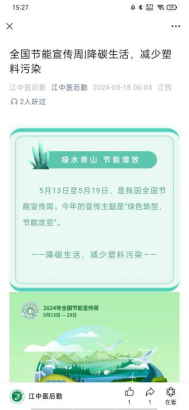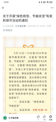 后勤保障服务中心充分发挥微信订阅号、视频号、微信群等网络载体的优秀宣传推广功能,推送节能环保小知识、小举措,倡导节水、节电、节粮、绿色消费、低碳出行、垃圾分类,强调减少塑料污染的必要性,践行绿色低碳生活。同时,紧紧围绕《公共机构节能条例》《江西省公共机构节能管理办法》、碳达峰碳中和、垃圾分类、限塑、反食品浪费、节约型机关建设、节水、志愿服务、绿色消费、低碳办公等主题开展绿宝碳汇有奖积绿币活动,充分调动了广大师生参与节能宣传周活动的积极性。