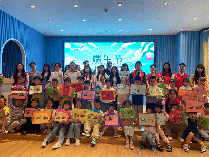 活动伊始,学生党员志愿者们通过讲故事的方式,向孩子们讲述了端午节的文化背景、起源、民俗活动以及伟大诗人屈原的故事。随后,学生党员志愿者们携手小朋友们一起制作创意粽子画和手工团扇,带领孩子们感受中华文化的魅力。孩子们利用手中的画笔和卡纸发挥着自己的奇思妙想,描绘着心中的粽子模样。“这里是粉色,这里是蓝色,这里是绿色。”孩子们边画边交流,在欢声笑语中展示着自己的创作。此外,学生党员志愿者们还特别为小朋友们准备了一场精彩的“庆端午”手势舞,小朋友们热情高潮,跟着音乐节奏拍起小手,现场气氛浓烈。