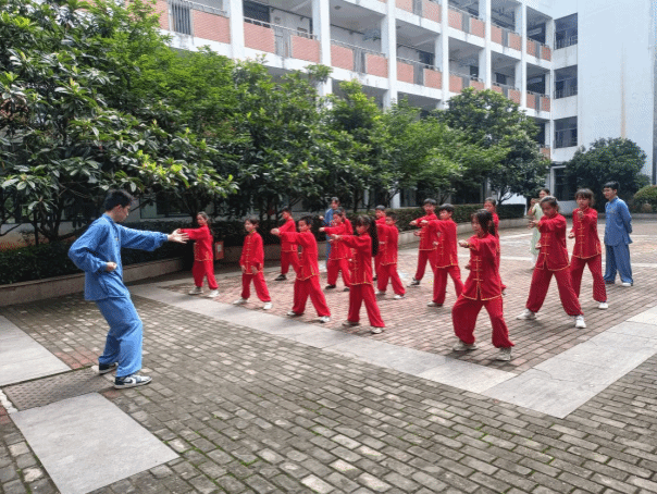 支部学生党员带领小学生们共同练习八段锦,同时向他们介绍传统养生功法所蕴含的保健智慧。伴随着八段锦音乐,大家神情专注,手臂缓慢起落、拉伸,时而屈膝下蹲,时而徐徐起立。