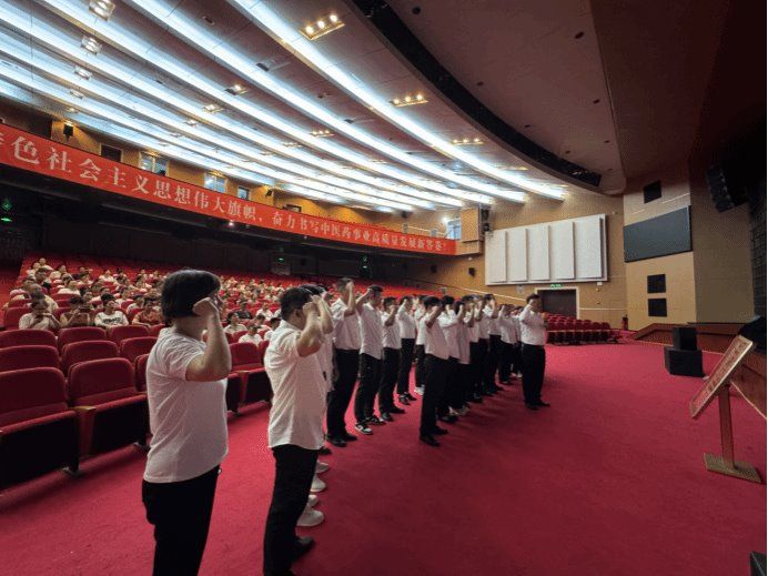 活动现场,全体党员面向鲜红的党旗,庄严地举起右手,重温入党誓词,在党旗下接受心灵的净化和洗礼,在铿锵有力的誓言中回望初心。随后,全体人员同唱一首歌——“唱支山歌给党听”,向伟大的中国共产党献上最诚挚的祝福,表达对祖国的赞颂、对红色岁月的追忆、对革命年代的礼赞之情。深情的旋律响彻礼堂,诚挚的话语心中飞扬,光荣的历史重回记忆,共产党的恩情永不忘。最后全体党员集中观看了红色影片《红海行动》。