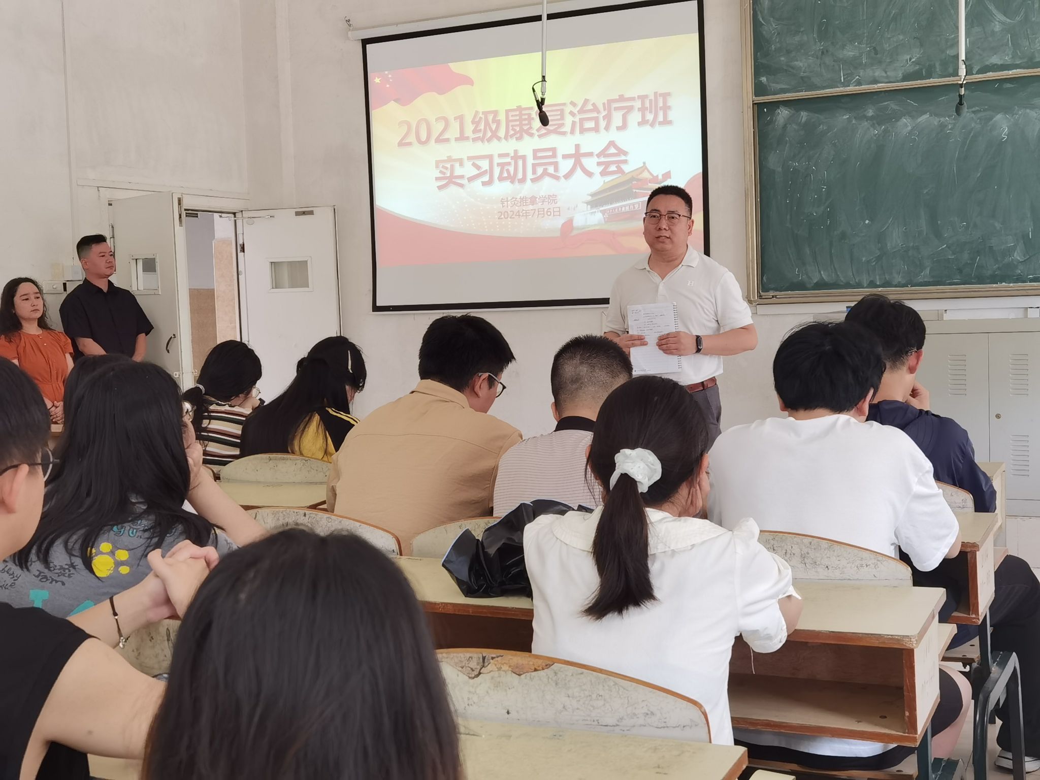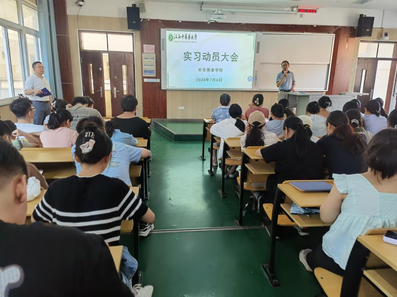 江中新闻网讯(通讯员 周世华 杨敏侃)7月6日,针灸推拿学院2020级针灸推拿学专业和2021级康复治疗学专业分别召开实习动员大会。学院党委负责人、教学工作负责人、学生工作负责人、教务处实习科负责人、辅导员以及2025届全体毕业实习生参加会议。