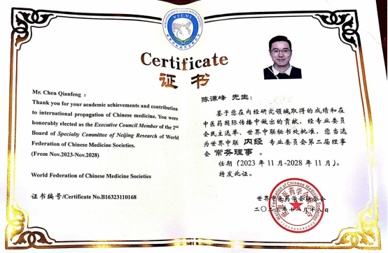 此外,陈谦峰主任还当选为世中联内经专业委员会第二届理事会常务理事,这标志着我校在《黄帝内经》研究领域的重要地位。