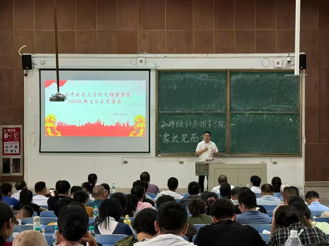 学院行政负责人代表学院向全体2024级新生及家长表示热烈欢迎,对家长们给予学院的信任表示了诚挚感谢,并向各位家长阐述了针灸推拿学院的发展历程、基本概况、办学条件以及人才培养的质量与特色,重点介绍学院专业学科情况、教学发展、专业设置、师资力量等方面,让家长对学院有更深入的了解。