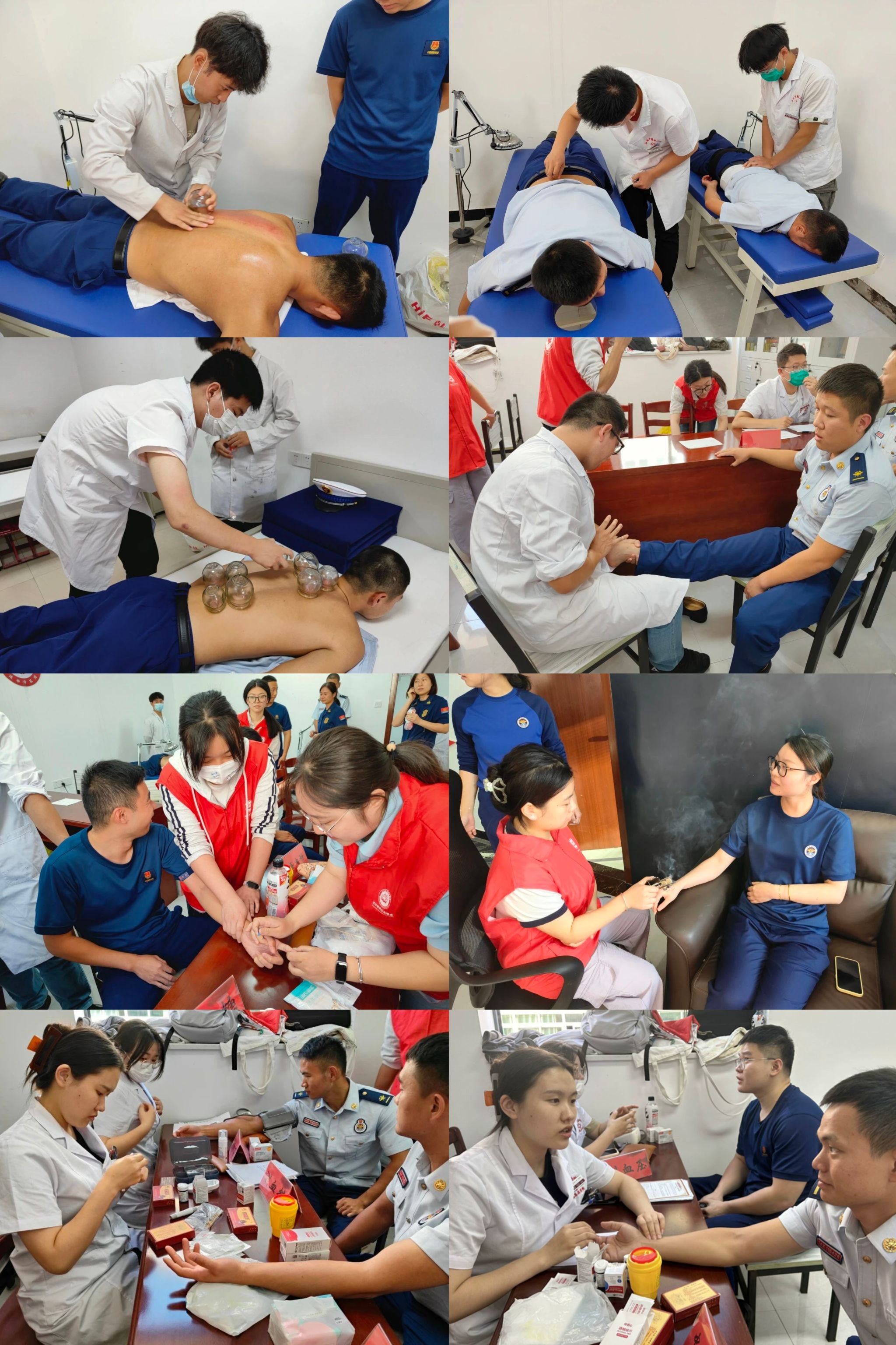 蓝朋友们对志愿者们的到来表示了热烈的欢迎。义诊现场,志愿者们细心为消防员们测量血压、血糖。针对消防员们工作中常见病痛如颈椎病、肩周炎、腰肌劳损、失眠等问题,骨科、针灸推拿科的医生们为消防战士们提供了针灸、推拿、拔罐、耳穴压豆等中医特色治疗。中医内科的医生们用专业的理论知识与丰富的临床经验为消防员们把脉问诊、答疑解惑,提供一对一个性化治疗和建议。