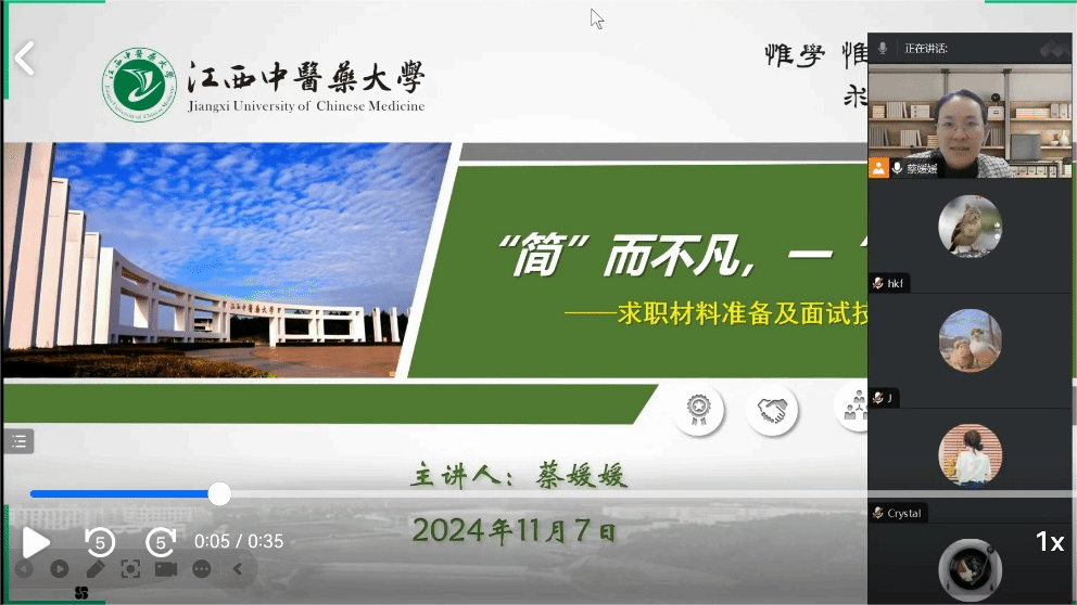 江中新闻网讯(通讯员 蒋艺涵) 11月7日晚,由创新创业学院、招生就业处主办,远志生涯咨询工作室承办的第3期“远志讲堂”在线上举办。本期活动由学校创业就业指导教研室主任蔡媛媛主讲,以《“简”而不凡,一“面”出彩》为题对学校2025届毕业生进行就业指导。