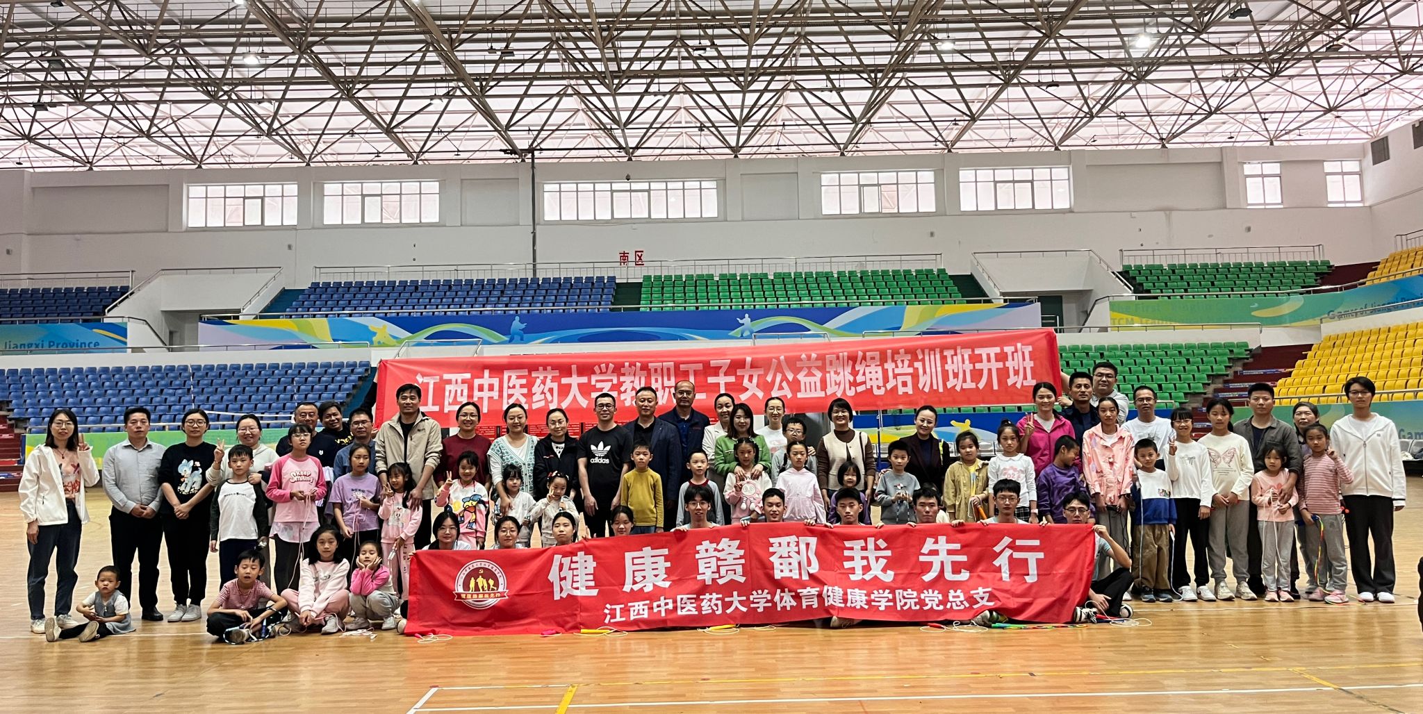 江中新闻网讯 11月16日下午,由体育健康学院党总支、校工会共同举办的学校教职工子女公益跳绳培训班在校体育馆正式开班,共有48名教职工子女参加了此次培训班。