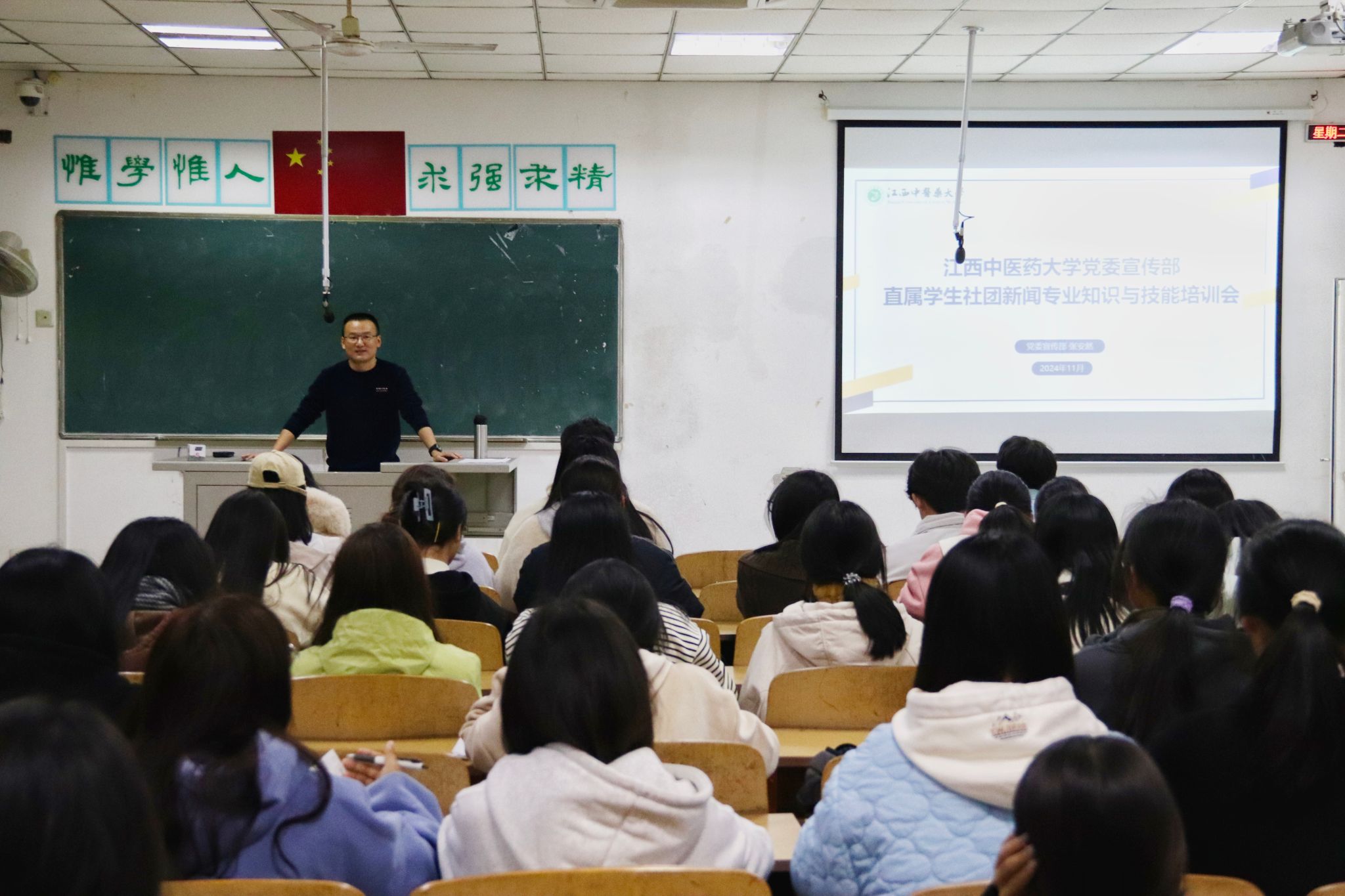 江中新闻网讯(记者 余浩 大学生融媒体记者 骆维亮)11月19日晚,党委宣传部在劝学楼5209教室举办直属学生社团新闻专业知识与技能培训会。本次培训会由党委宣传部副部长主讲,党委宣传部直属学生社团100余名成员参加培训。