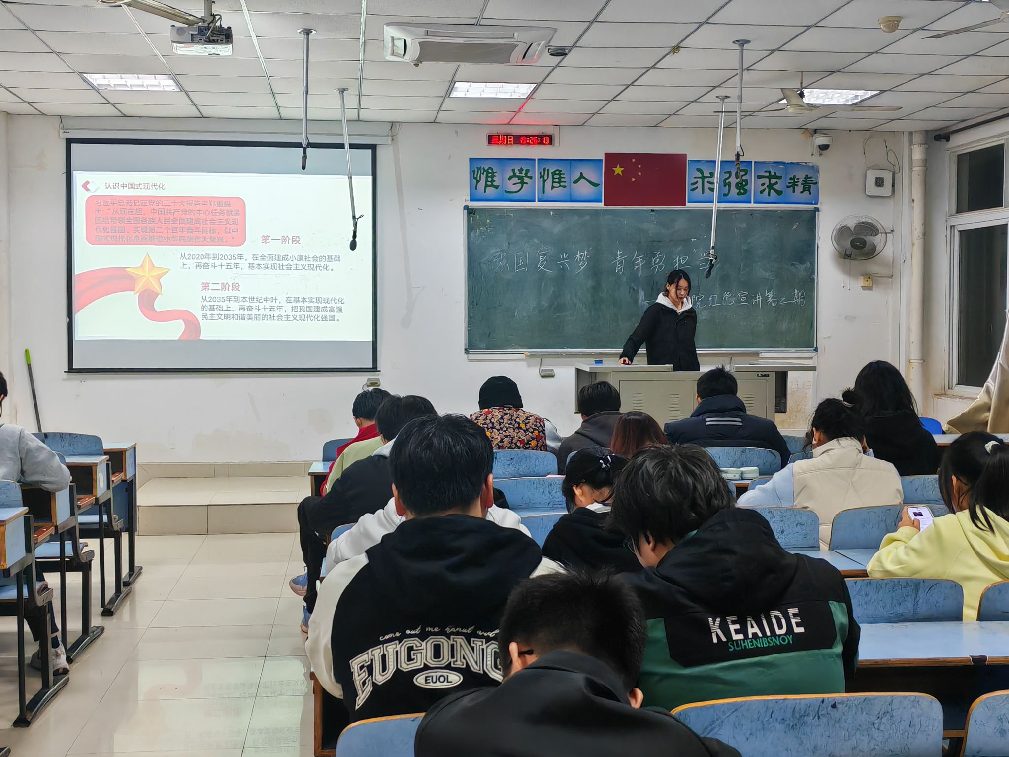 本次宣讲围绕感悟英雄事迹,认识中国式现代化展开。宣讲员以饱满的热情讲述了革命先烈为了民族独立和人民解放抛头颅、洒热血的英勇事迹,深入探讨了中国式现代化的内涵和意义,详细介绍了两个阶段的奋斗目标。宣讲员的讲述语言生动充满激情,聆听宣讲的同学们深受触动和鼓舞,现场掌声不断。